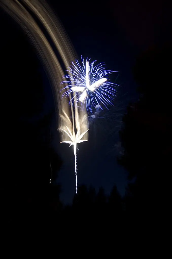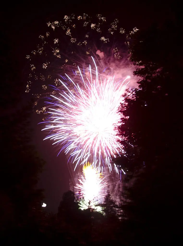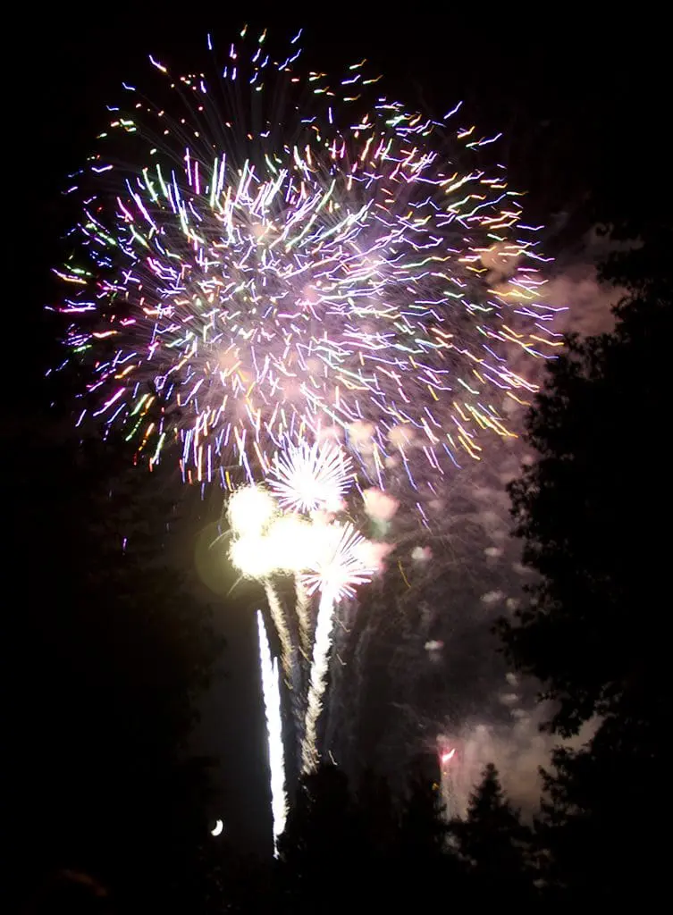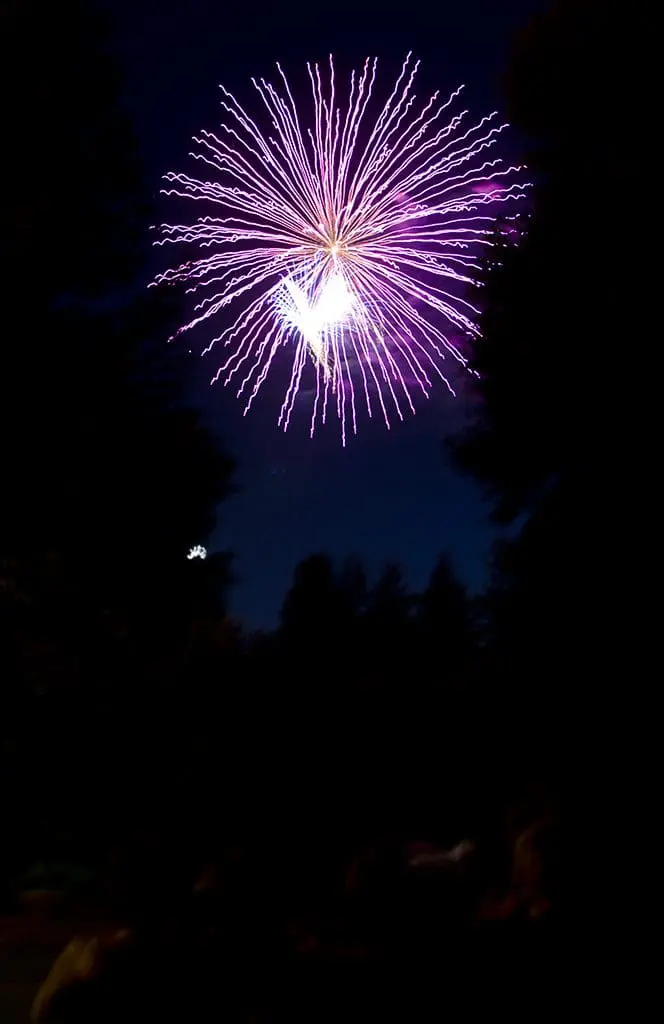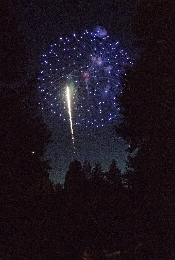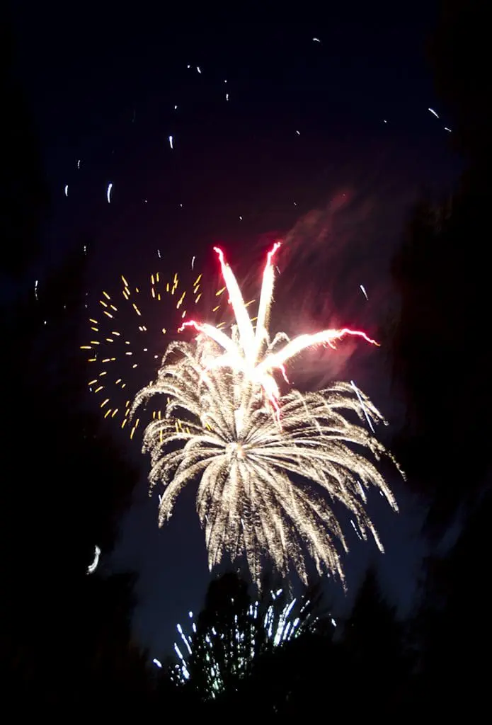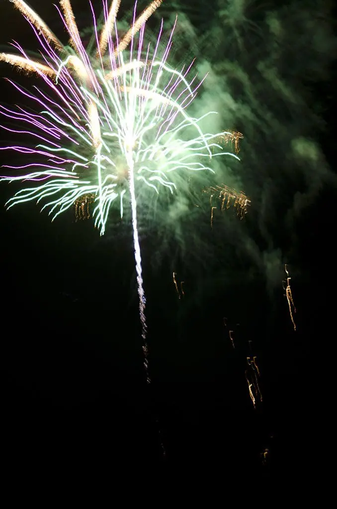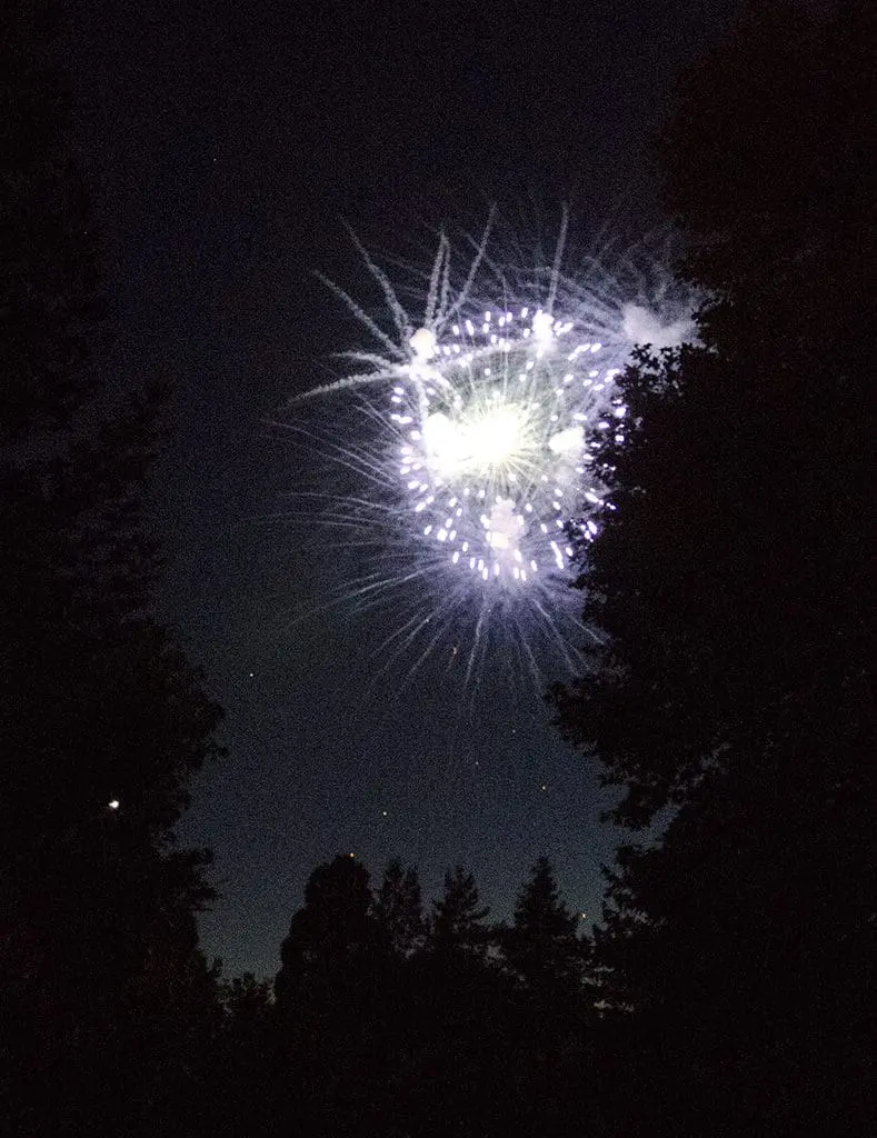 Note to fellow photographers: these were all shot hand-held using a vibration-reduction zoom lens with the focus set at infinity. Most were taken at about 28mm (wide-angle). About a third of them were shot at high ISOs (i.e., anything up to and including 25,600) while the remainder were shot at ISO 200. I was experimenting with different ISOs based on some advice for photographing fireworks on Ken Rockewell’s site, www.kenrockwell.com (if you don’t know about Ken, you should — even if you disagree with some of his views on photography you’ll find a wealth of ideas on his site).