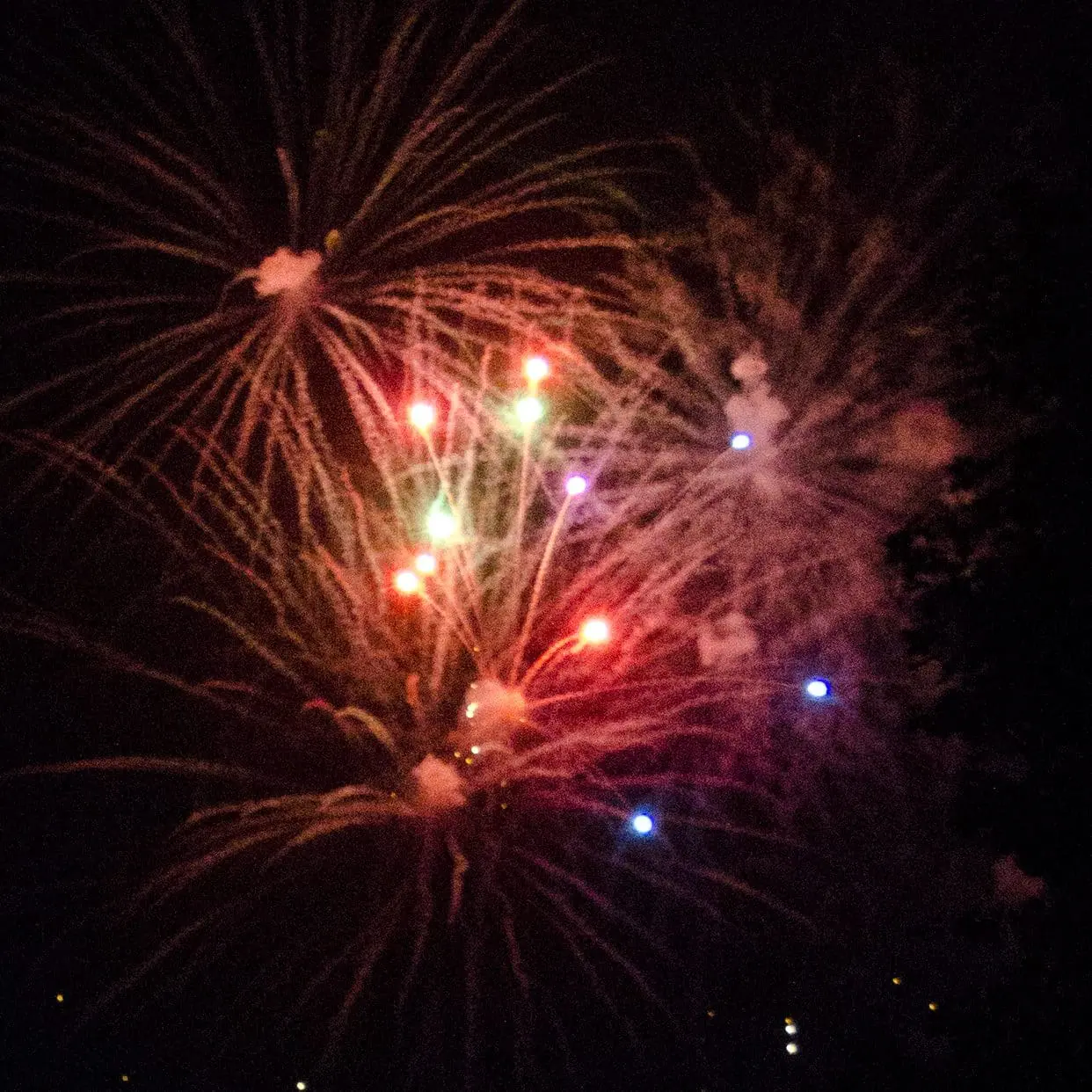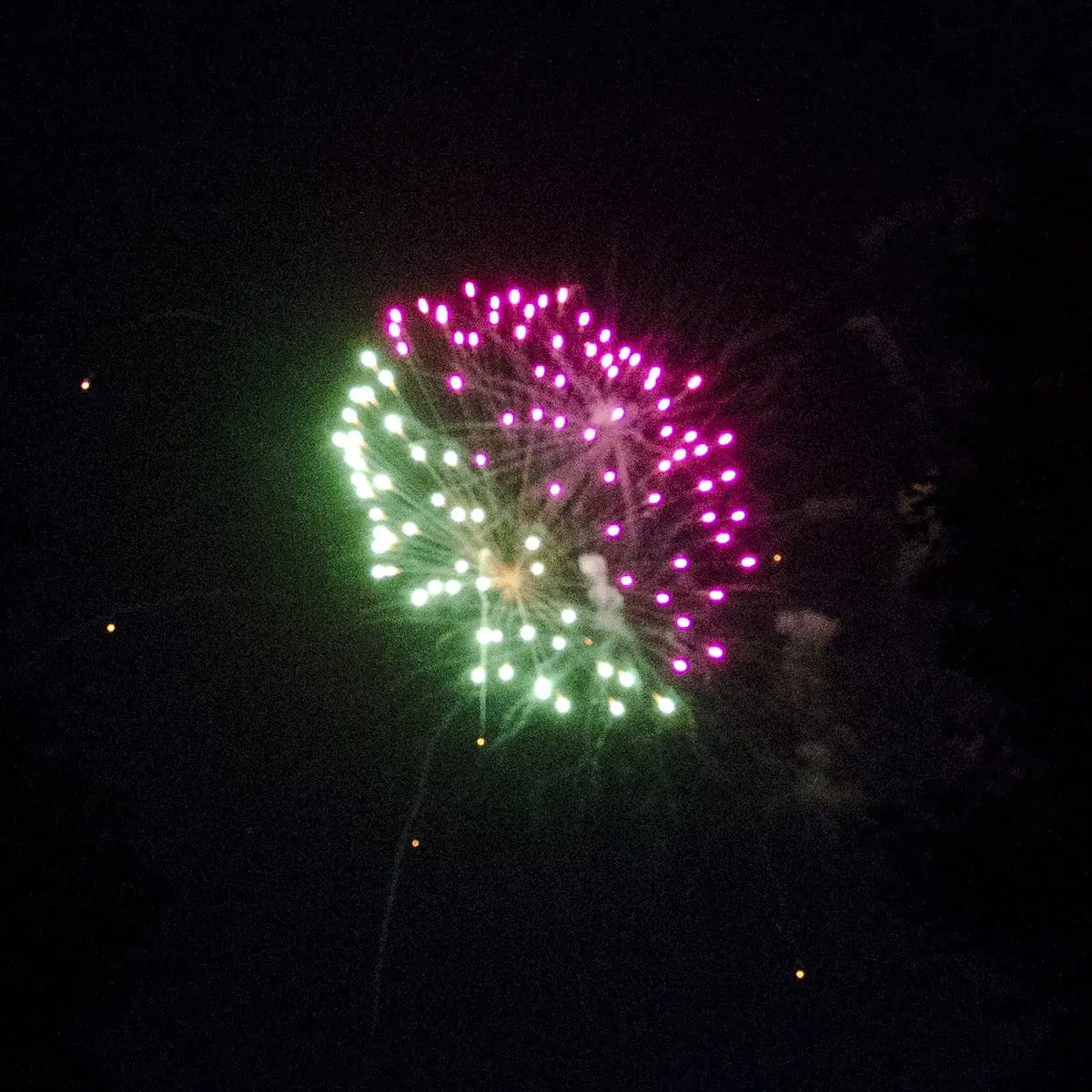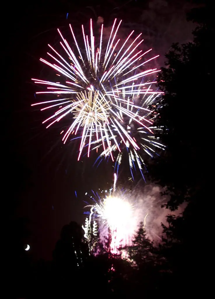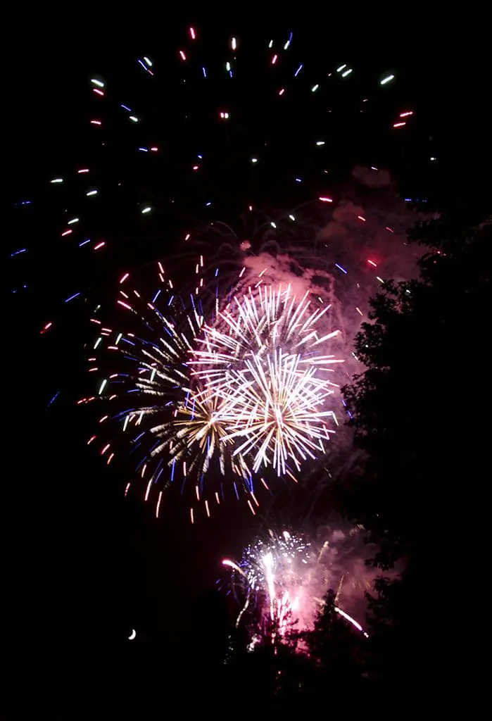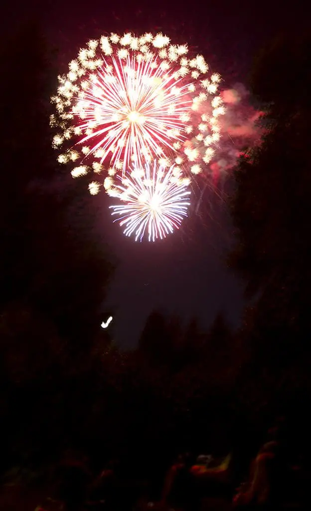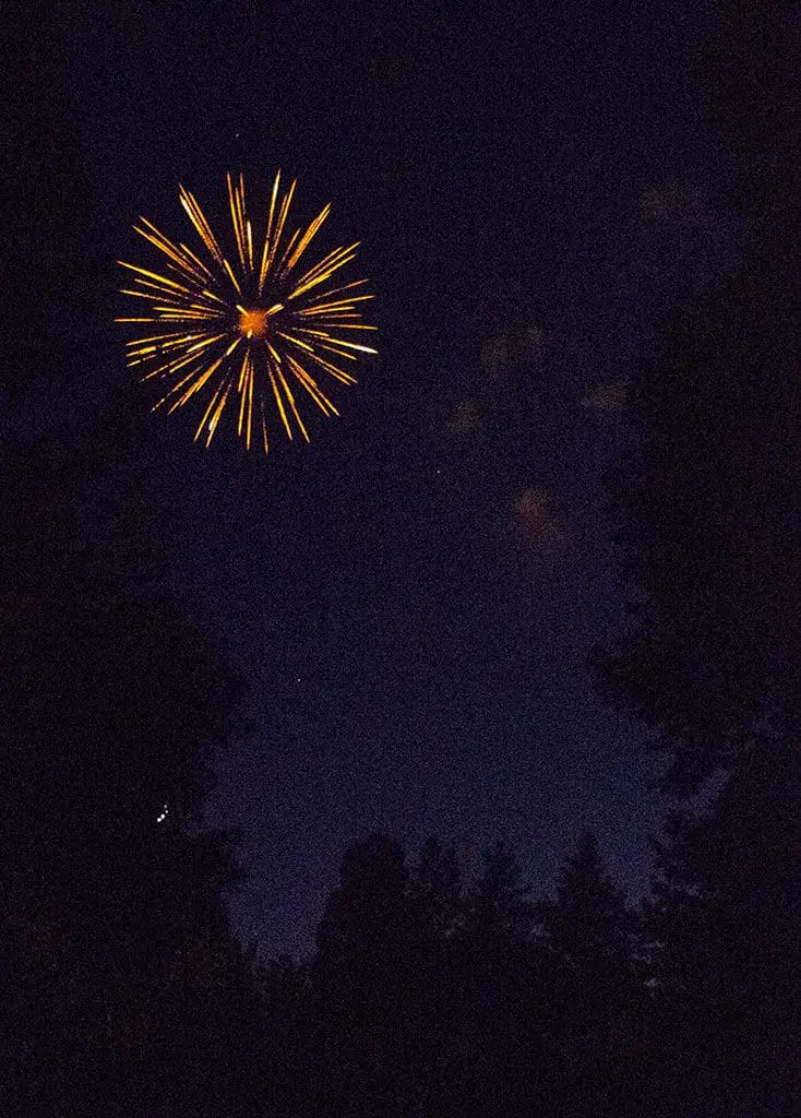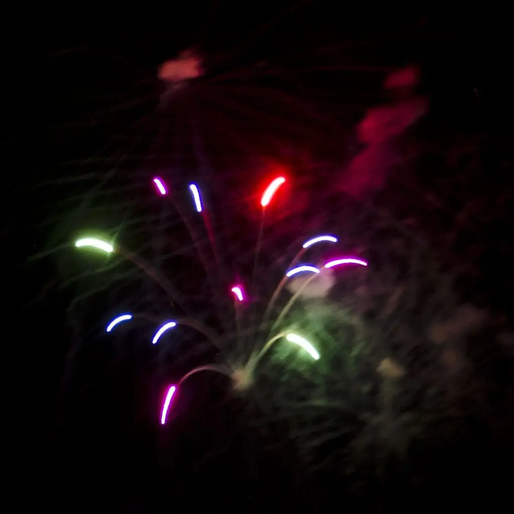 Note to fellow photographers: these were all shot hand-held using a vibration-reduction zoom lens with the focus set at infinity. Most were taken at about 28mm (wide-angle). About a third of them were shot at high ISOs (i.e., anything up to and including 25,600) while the remainder were shot at ISO 200. I was experimenting with different ISOs based on some advice for photographing fireworks on Ken Rockewell’s site, www.kenrockwell.com (if you don’t know about Ken, you should — even if you disagree with some of his views on photography you’ll find a wealth of ideas on his site).