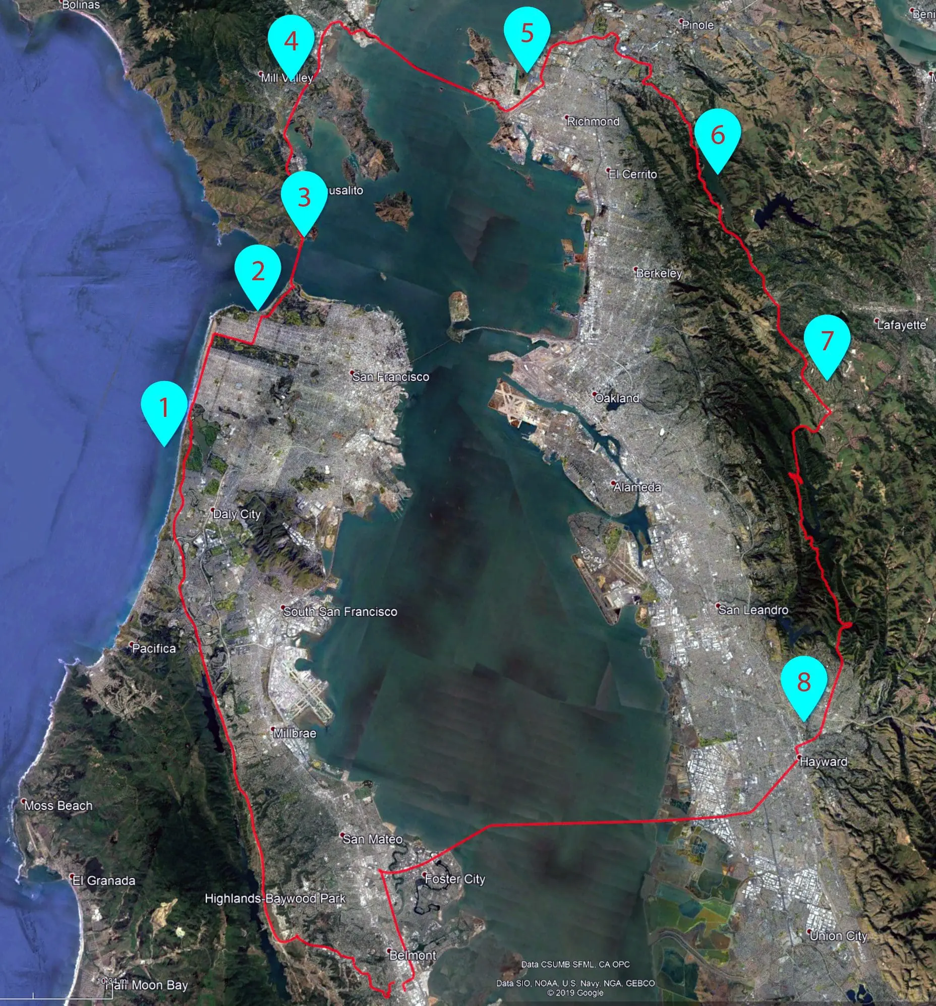 Riding around all of San Francisco Bay would be an all day affair unless you stuck to freeways and what would be the point of that? But the Bay is conveniently bisected by the San Mateo/Hayward Bridge1 This first ride covers the northern half of San Francisco Bay.