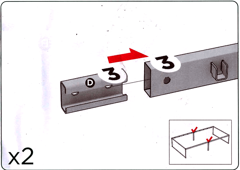 A major problem appears at step 5. You are trying to slide a sidebar into a coupling mounted on the end of another sidebar, each half the length of a twin bed (call it 40 inches each). The coupling you’re sliding the second sidebar into is very tight; there’s very little gap into which the sidebar must fit. That’s a feature, not a flaw, because if the gap was wider the bedframe could easily make itself loose at the coupling point.