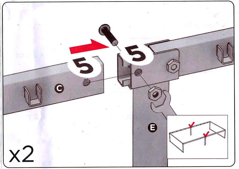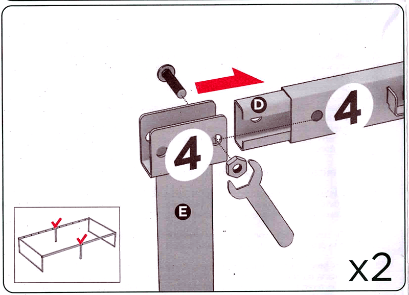 This essentially merges steps 4 and 5. Leave the bolts loose to provide play so the rest of the assembly works more smoothly. You’ll probably have to put a bolt through the coupling and the two sidebar pieces before you mount the foot piece (“E”) that covers and reinforces the coupling. That’s so you don’t push the coupling so far that you can’t line up the holes in it and each of the two sidebar pieces. You then remove the bolt, put the foot piece in place, and connect it to the sidebar with the provided bolts. - Mount the assembled sidebars onto the two end frames. Take care to ensure you orient the sidebars so the flanges which hold the cross-braces are, again, (a) on the inside of the the frame and (b) oriented so the “cups” face up.