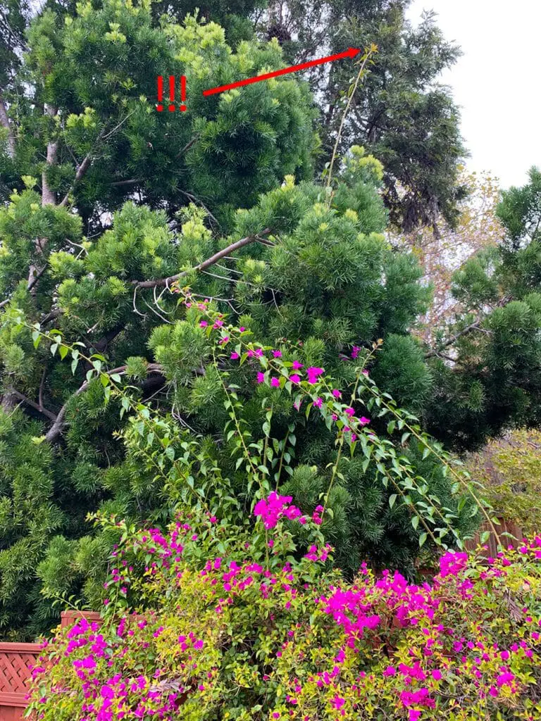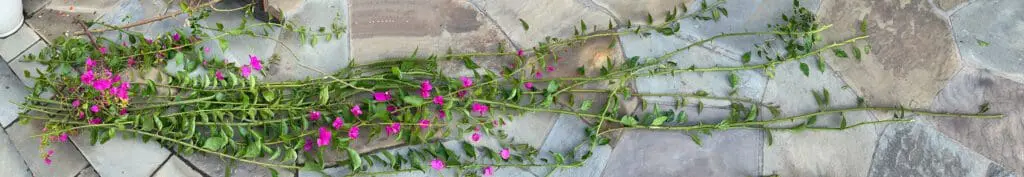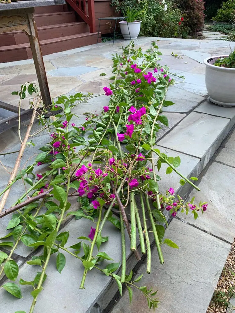 I decided to cut the long shoots off and get rid of them. That was a trial in and of itself, because — surprise! — bougainvillea plants have thorns. And not just any thorns, mind you. These suckers put dinky little rosebush thorns to shame.
