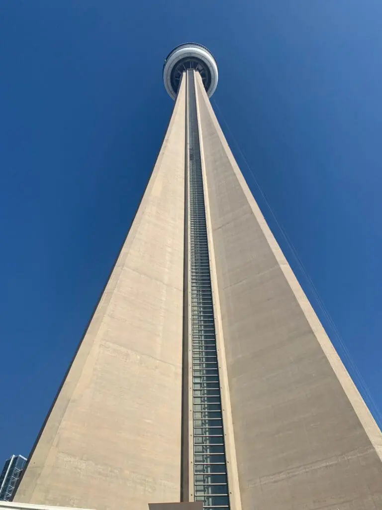 We started off our explorations by visiting the CN Tower. Which, while very touristy, is something you just must do, at least the first time you visit Toronno (the second T is silent, unless you’re from out of town). We splurged an extra $10 each to be able to go up to the topmost observation nacelle (33 floors above the main observation deck). Here’s what the Tower looks like from ground level: