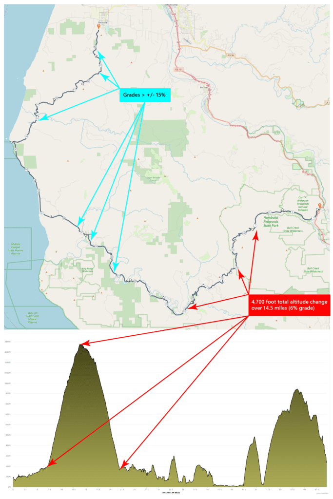 There are roads through the Lost Coast…for various values of “road”. Actually, given how unstable and lightly-populated the area is, Humboldt County does a great job of maintaining Mattole Road, the primary route through the Coast. But “great” in this instance means “frequent potholes and some gravel stretches”, all of which makes riding a bike more of a challenge.