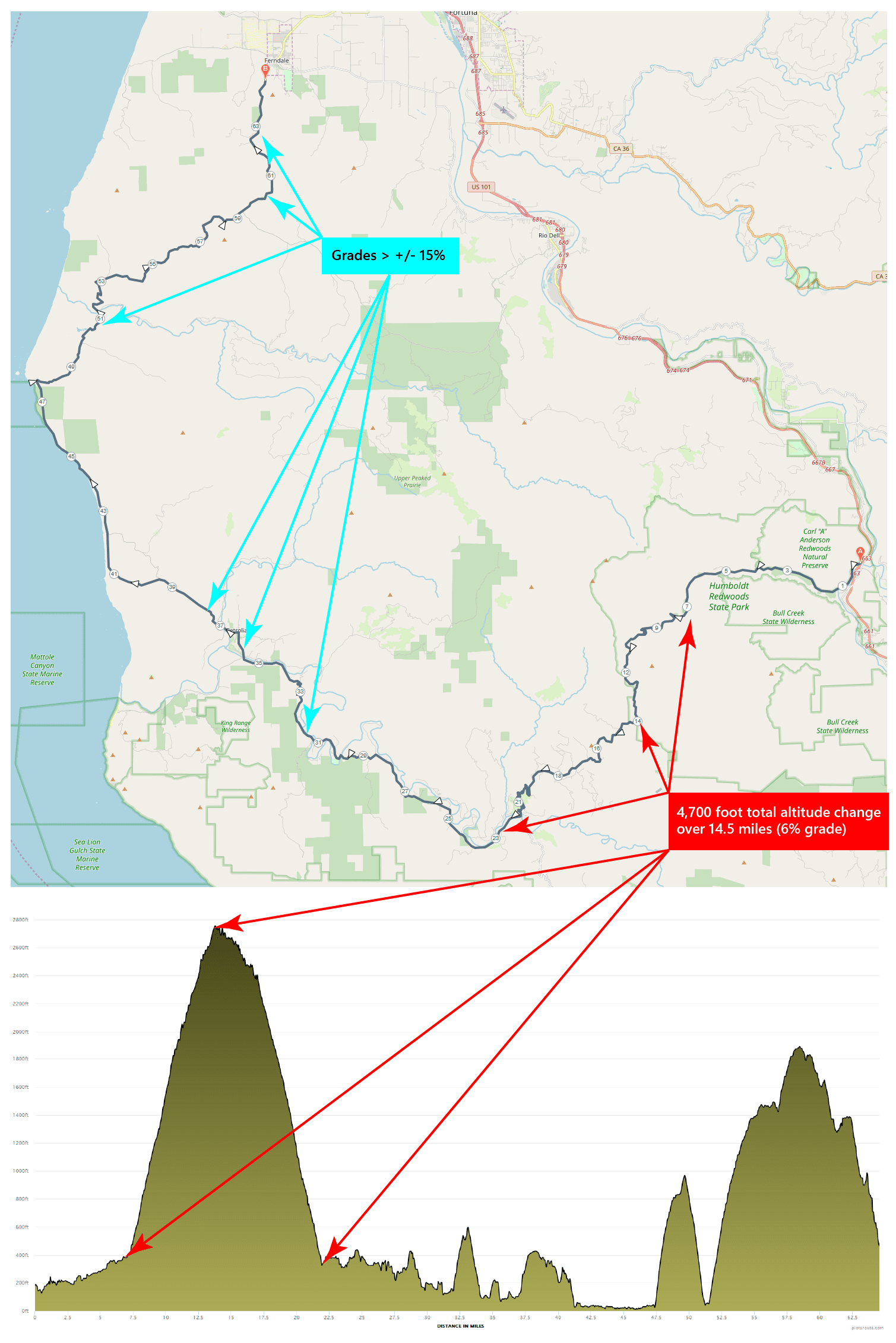 There are roads through the Lost Coast…for various values of “road”. Actually, given how unstable and lightly-populated the area is, Humboldt County does a great job of maintaining Mattole Road, the primary route through the Coast. But “great” in this instance means “frequent potholes and some gravel stretches”, all of which makes riding a bike more of a challenge.