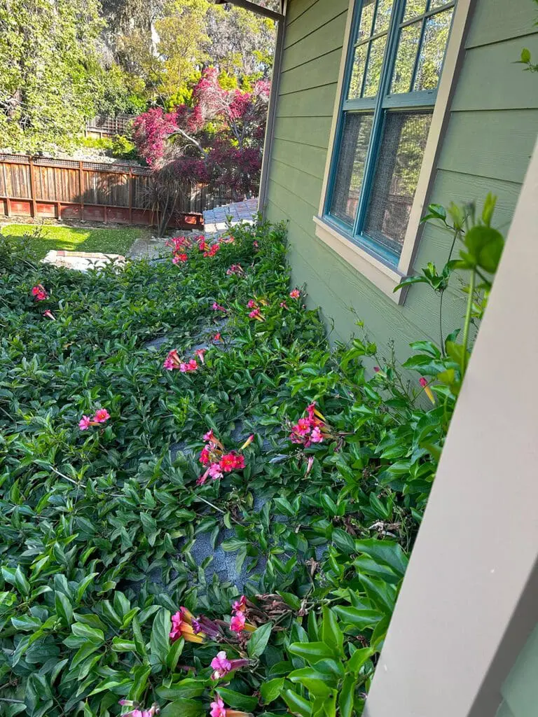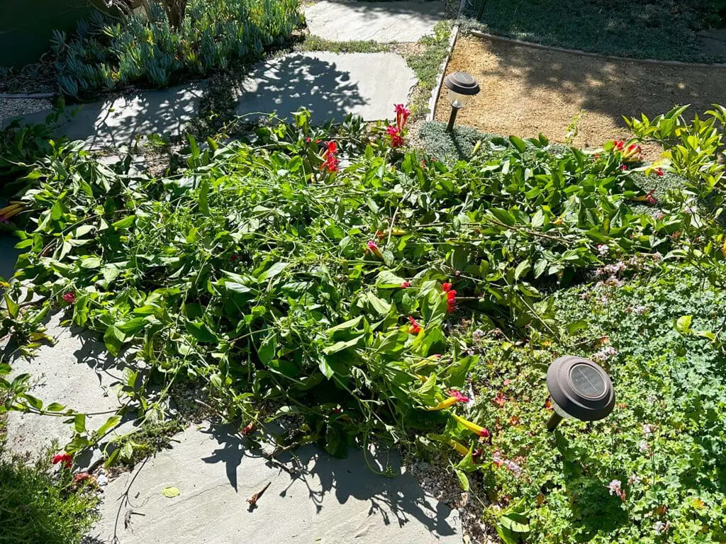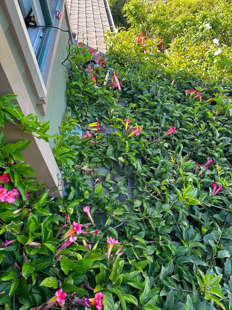 But there is one downside to the canopy: whatever the plant is — I call it “orange trumpet flower” for reasons that will be obvious once you glance at the photos — it is incredibly robust and fast growing. While it definitely isn’t kudzu, it clearly wants to be! Twice a year I have to get up on the roof to trim it back.