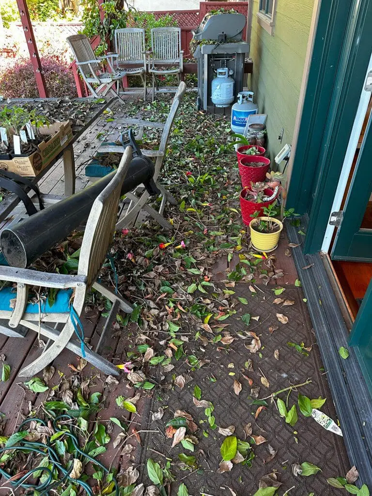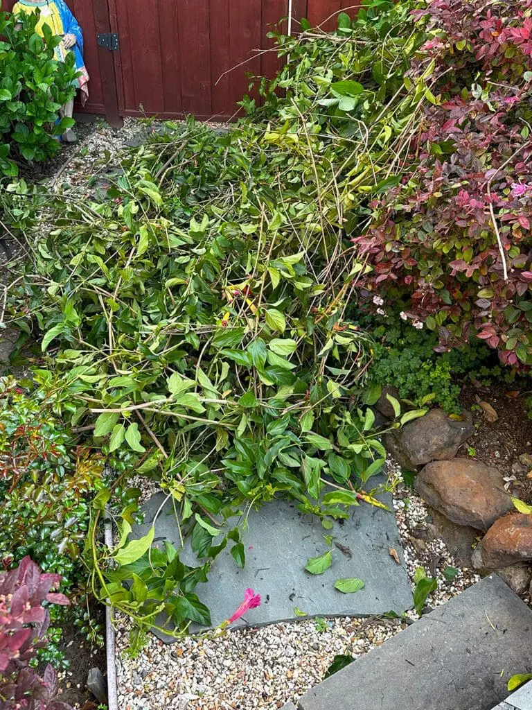 It took over an hour with a hedge trimmer, tree shears and clippers to trim it back to where it belongs. Which also created massive amounts of debris down below:
