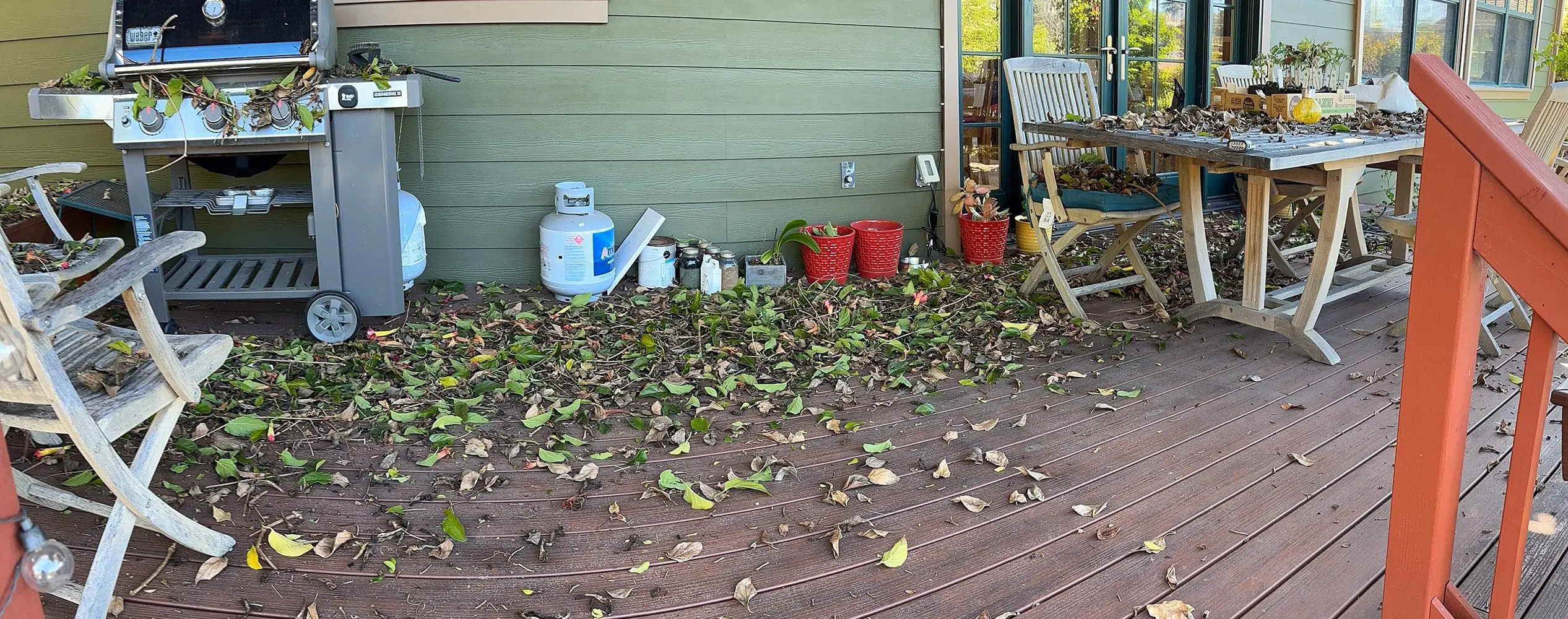 It took over an hour with a hedge trimmer, tree shears and clippers to trim it back to where it belongs. Which also created massive amounts of debris down below: