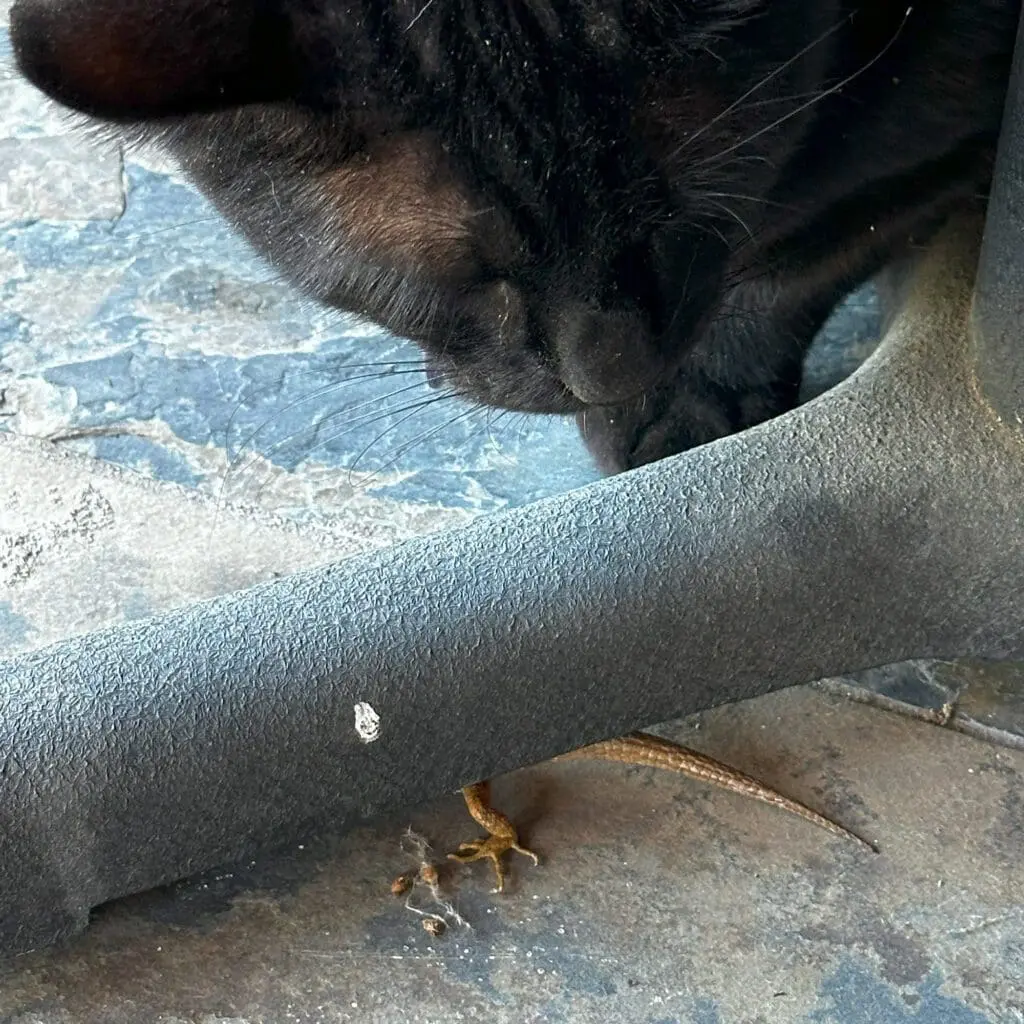 The lizard — probably in desperation — had figured out how to arrange his body underneath one of the table’s feet so the cat couldn’t get at him.