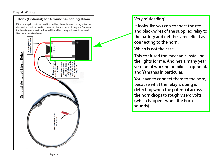 I solved that by punting most of the installation to my mechanic (thanx, Jim, at GP Sports!). He initially wasn’t able to get the “jump to full power when hitting the horn” feature to work. The Clearwater instructions fell down on the job here a bit, as you can see in the following edited extract: