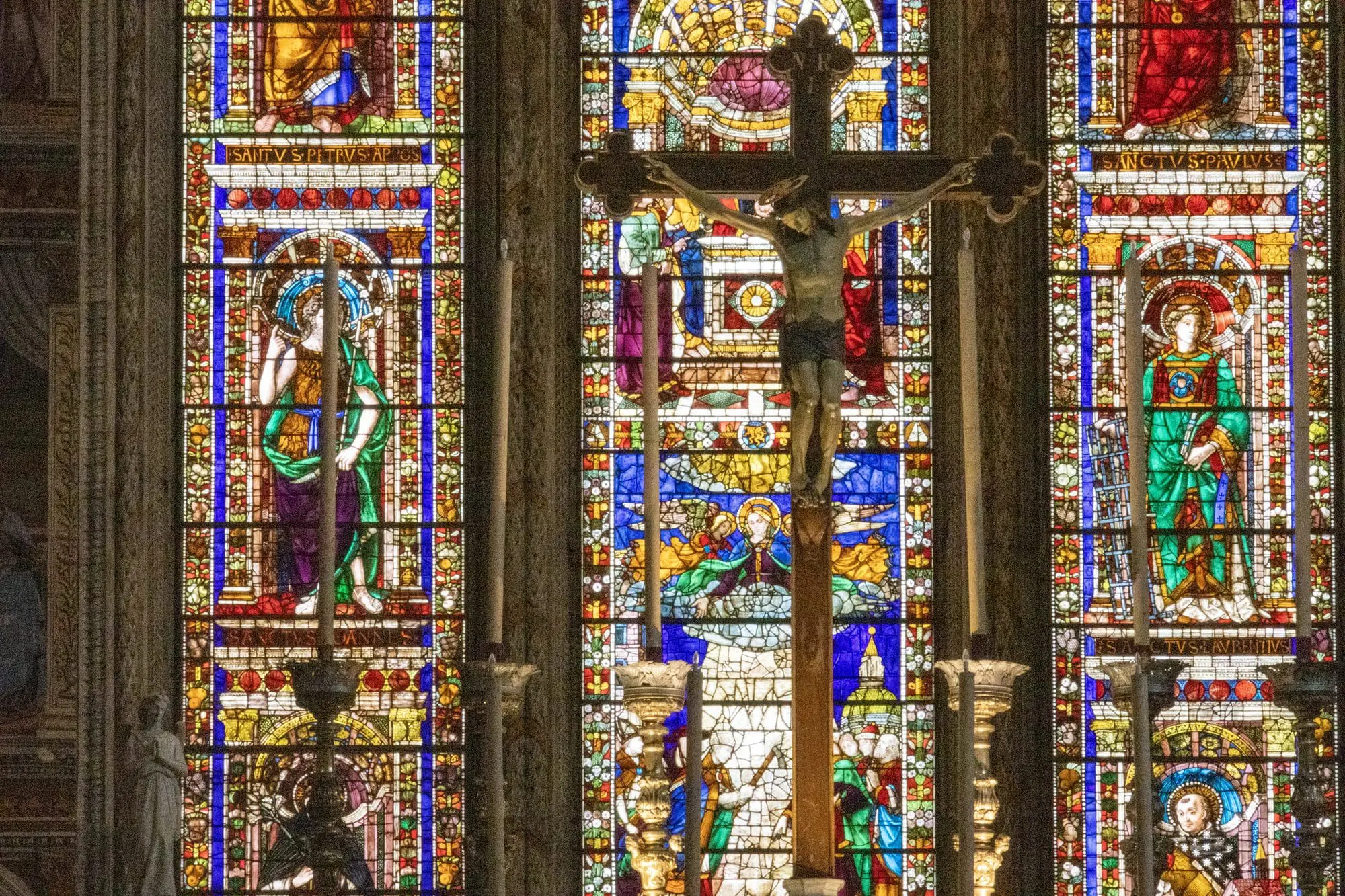 The sanctuary, though, was spectacular. Not one, but two very large crosses2, an enormous amount of statuary, and paintings and stained glass in abundance.