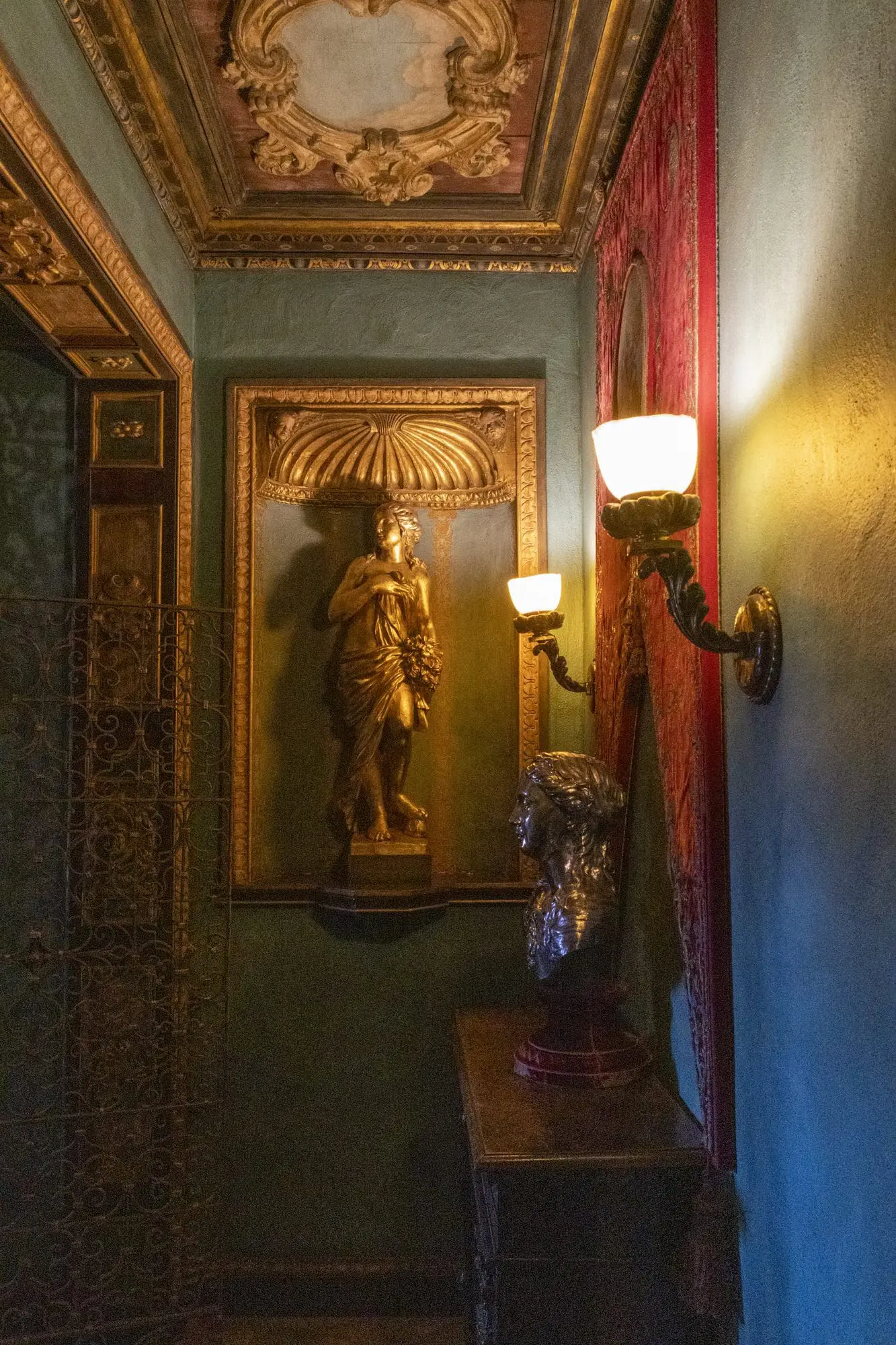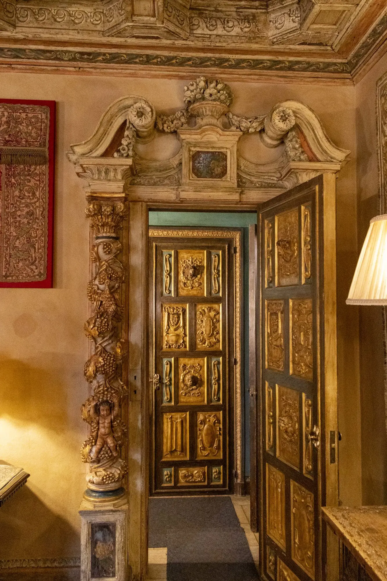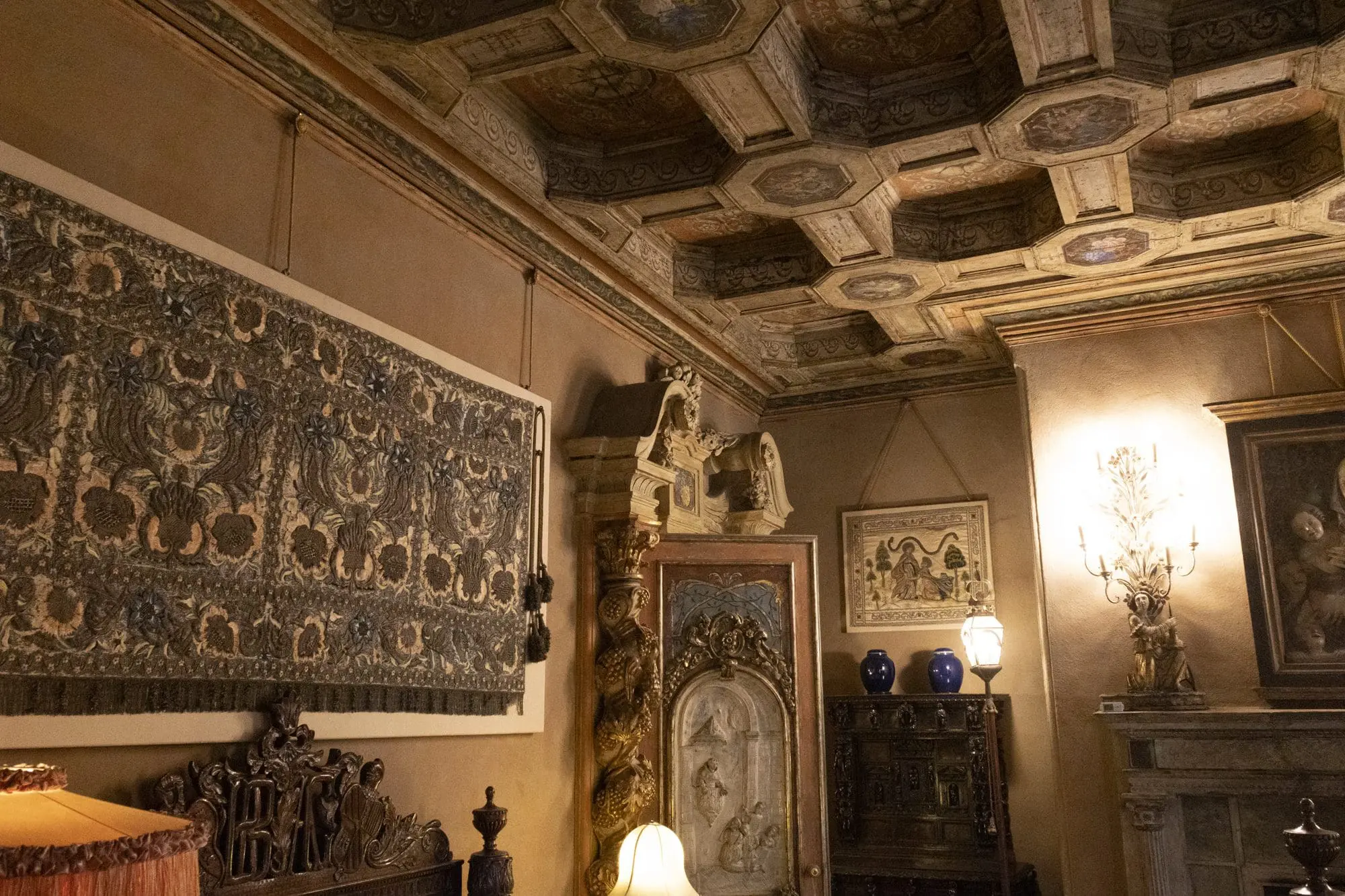 Stepping through the doorway puts you into a high-ceiling room filled with all sorts of art. Not to mention a massive fireplace, only part of which is original (the rest was carefully crafted to match). As with the great houses we saw on our recent trip to Italy, the ceilings themselves are integral parts of the display.