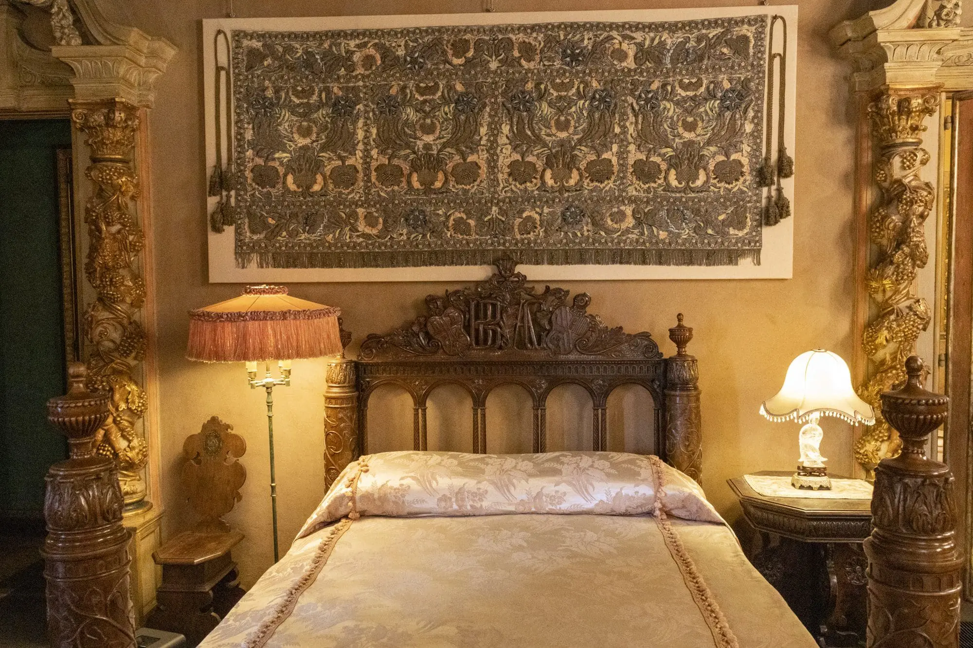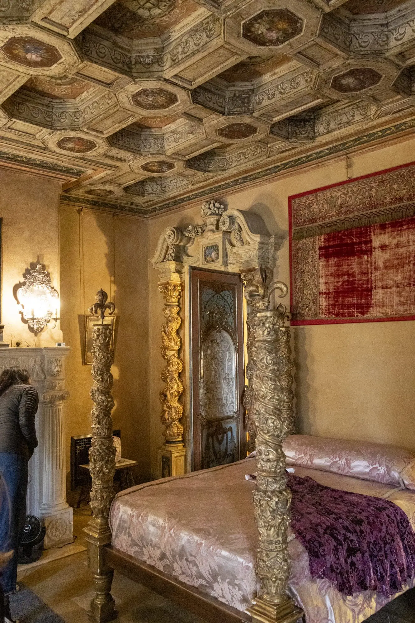 I expected to see a king-sized bed, at least, in Hearst’s bedroom, to go along with his king-sized personality. But his bed looks like a basic queen. However, our docent told us it was modified to be seven feet long…but didn’t appear so, because the room itself was so large.