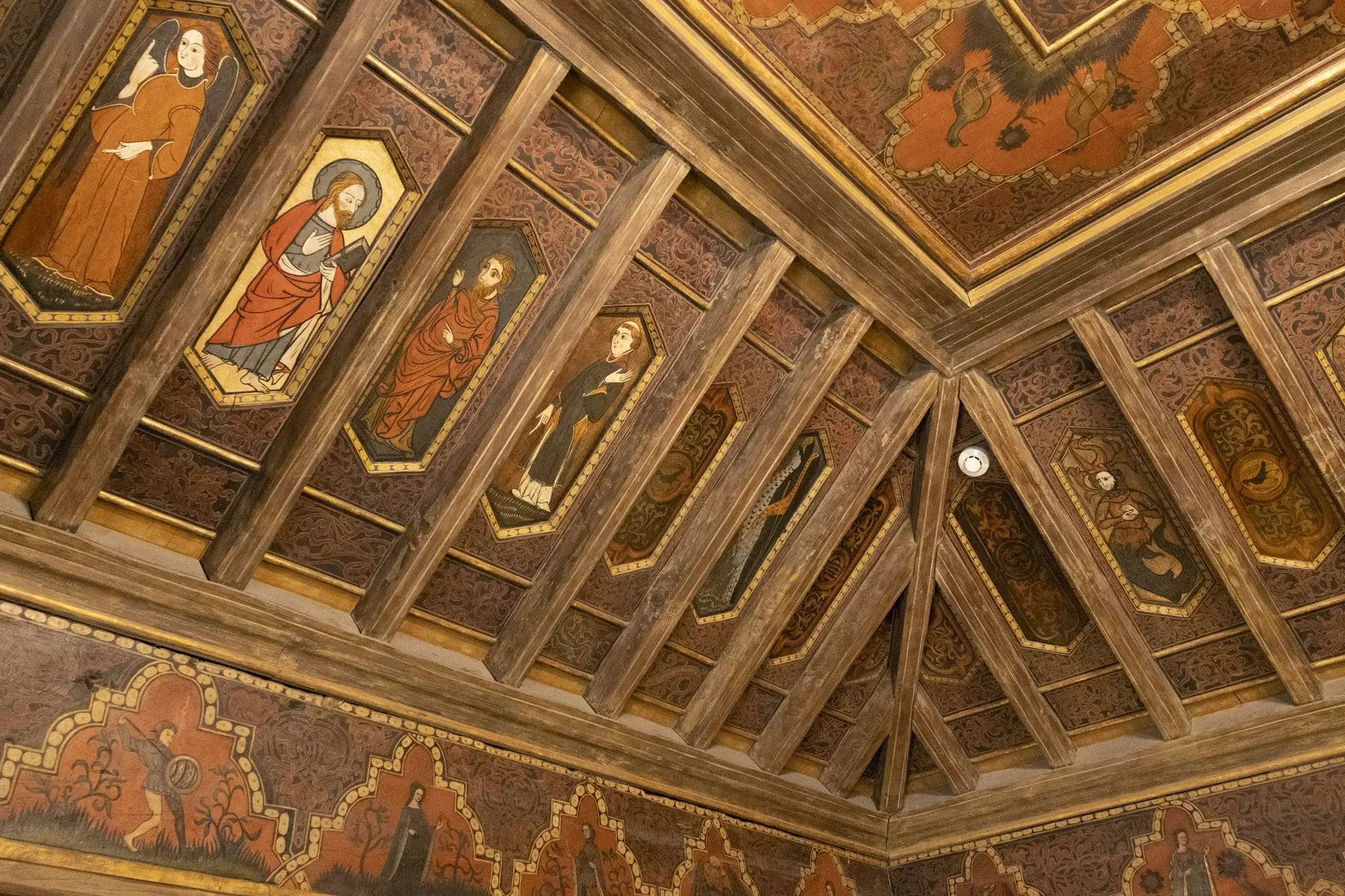 Stepping through the doorway puts you into a high-ceiling room filled with all sorts of art. Not to mention a massive fireplace, only part of which is original (the rest was carefully crafted to match). As with the great houses we saw on our recent trip to Italy, the ceilings themselves are integral parts of the display.