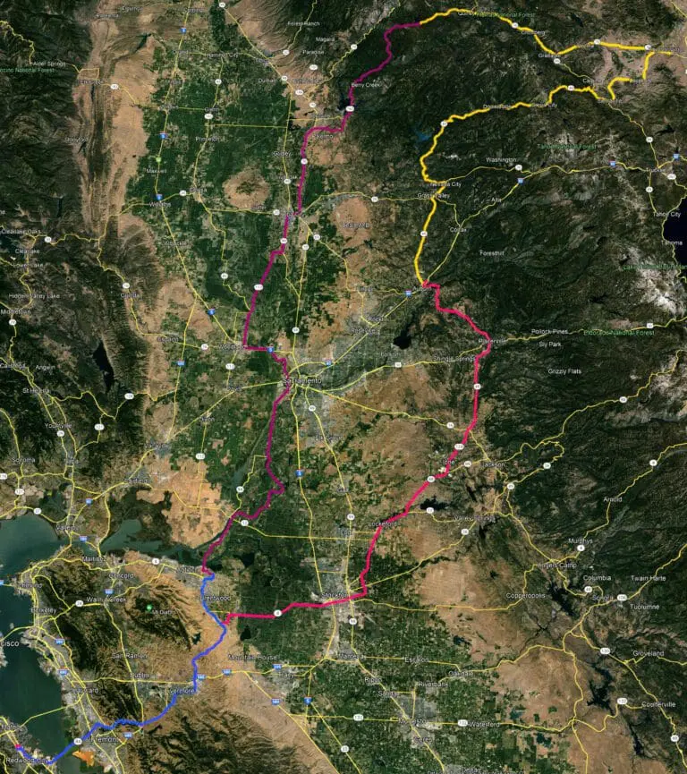 On the way to Beckwourth Pass (Day 1) The ride up to Auburn by way of Stockton was, as usual, fun! Better yet, it wasn’t unusually windy in the Altamount Pass area north of Livermore. Although the wind turbines were sure spinning! At one point it looked like they were